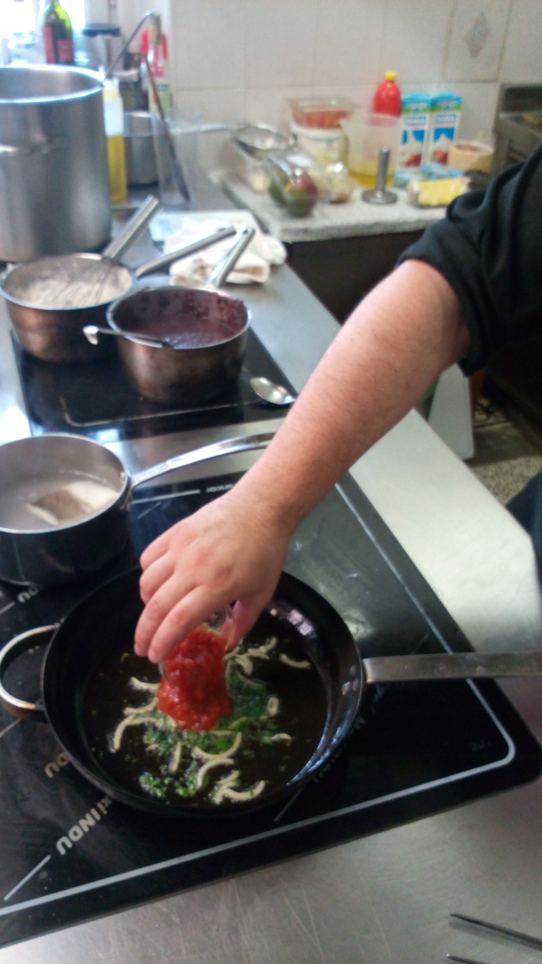 Preparazione brodo: far bollire, filtrare, adagiare il filetto di merluzzo nel brodo a 70°max e lasciarlo in precottura circa 10minuti